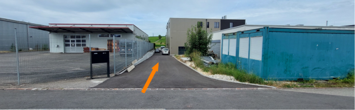 Von der Grienackerstrasse, nach dem Zaun und vor den hellblauen Containern, links reingehen.