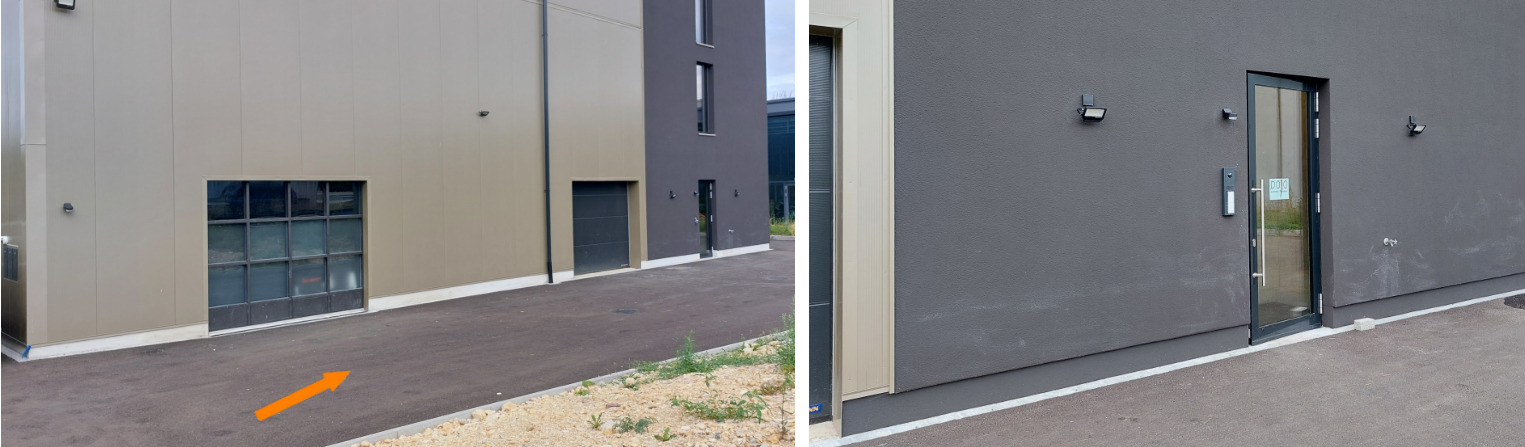 Vor dem Fenster der Autogarage nach rechts zur hintersten Türe gehen.